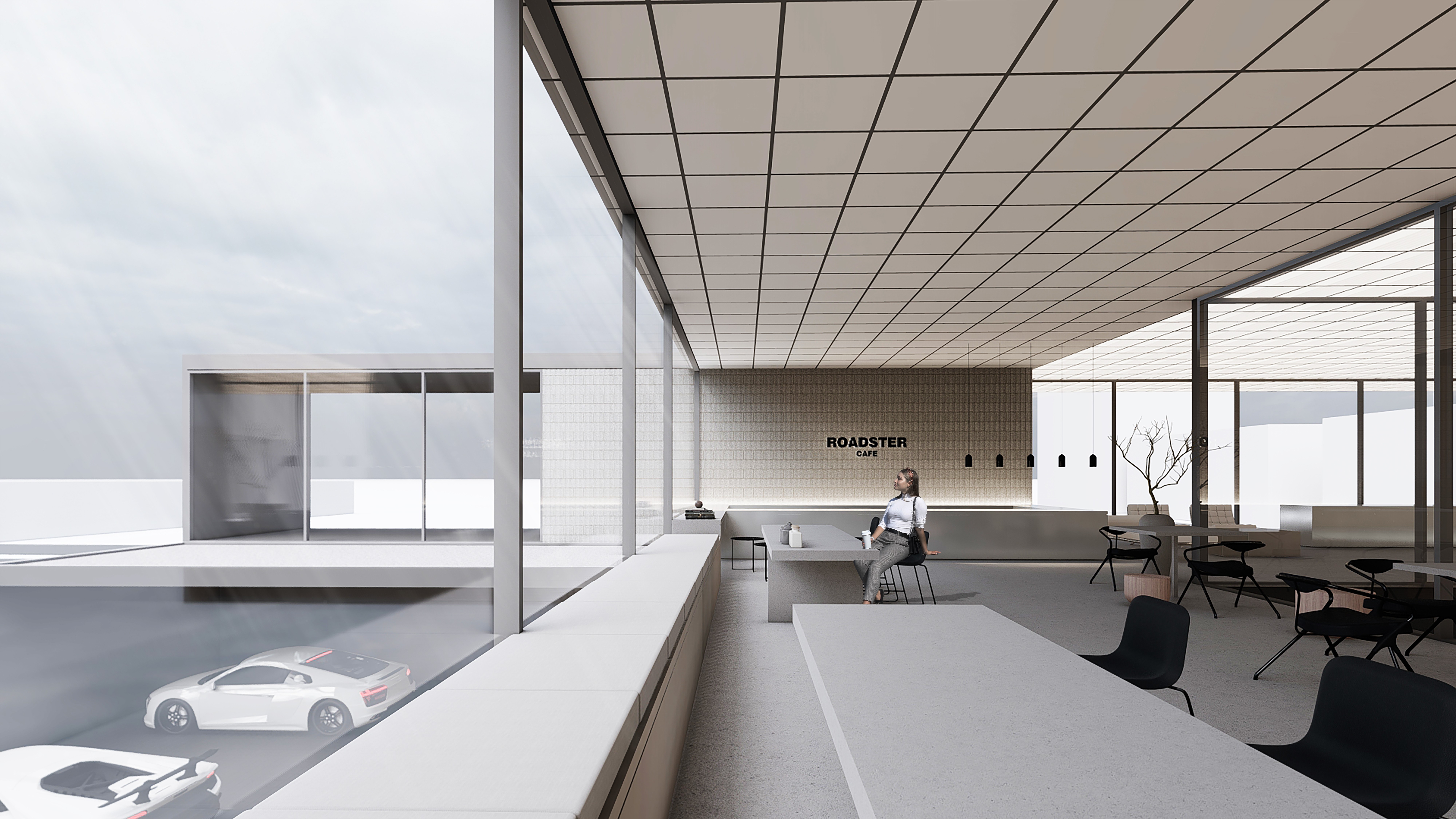 Named ROADSTER CAR HOTEL, the facility is not just a parking garage but a car care destination. In customer zones, staggered acoustic baffles and linear lighting elements are strategically placed to evoke a sense of movement, inspired by the "light streak" effect seen in photographs capturing the motion of cars. The design goes beyond the conventional car-care facility, embracing simplicity through the use of glass and stone materials. The entrance, featuring a hydraulic ramp, welcomes daylight and panoramic views, elevating the architectural narrative beyond the typical "car-wash" program.