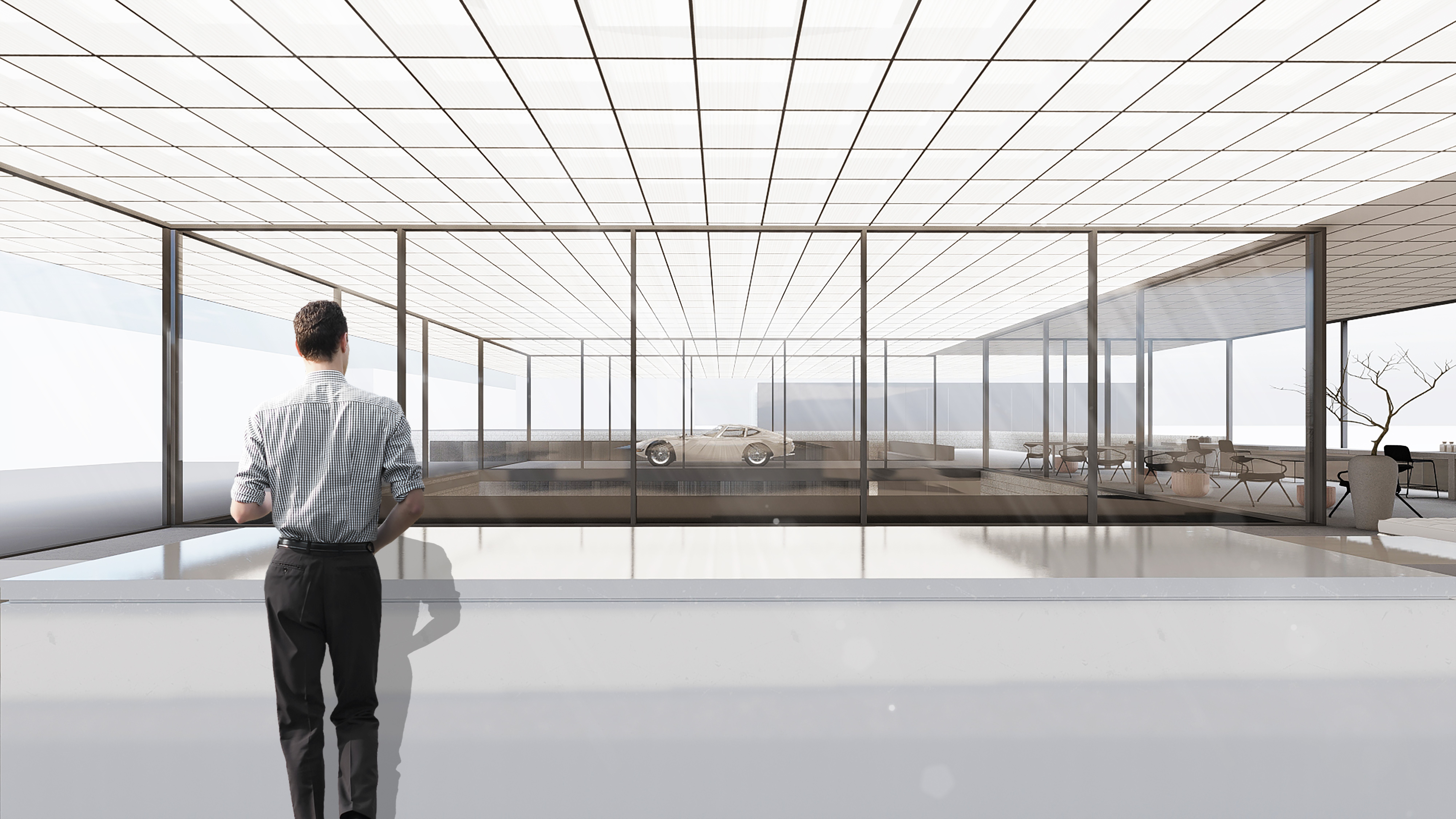 A remarkable feature of the ceiling grid is its independently controlled zones, allowing for preset options to illuminate each vehicle individually. This innovative design choice ensures that each car becomes a focal point, enhancing its visual appeal within the exhibition space. The combination of the luminous ceiling and a mirrored rear wall creates the illusion of an endless, sky-lit space, adding a touch of grandeur to the overall ambiance.