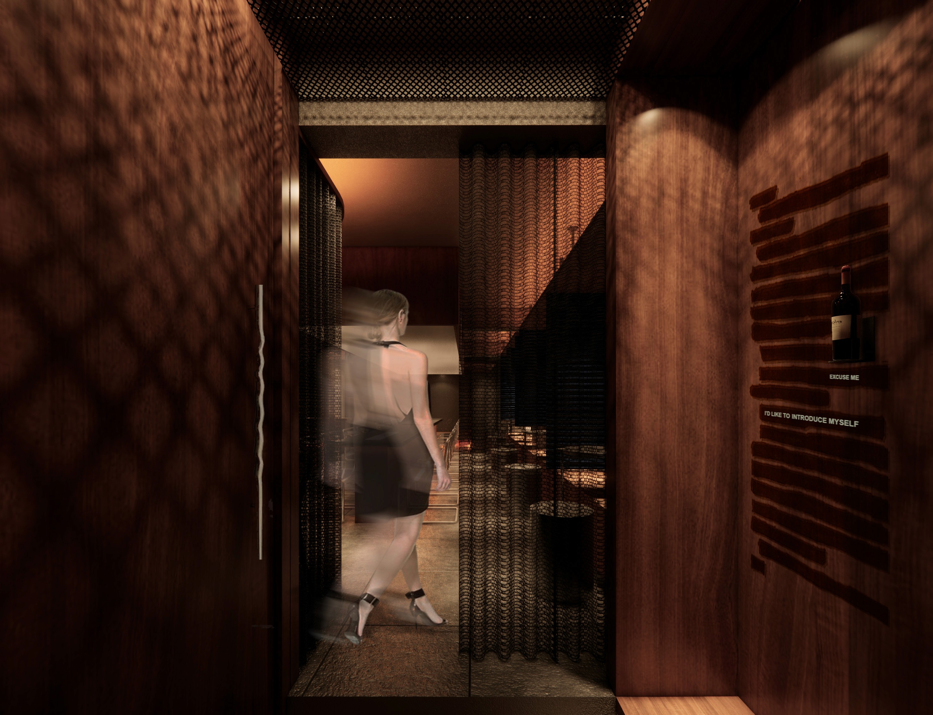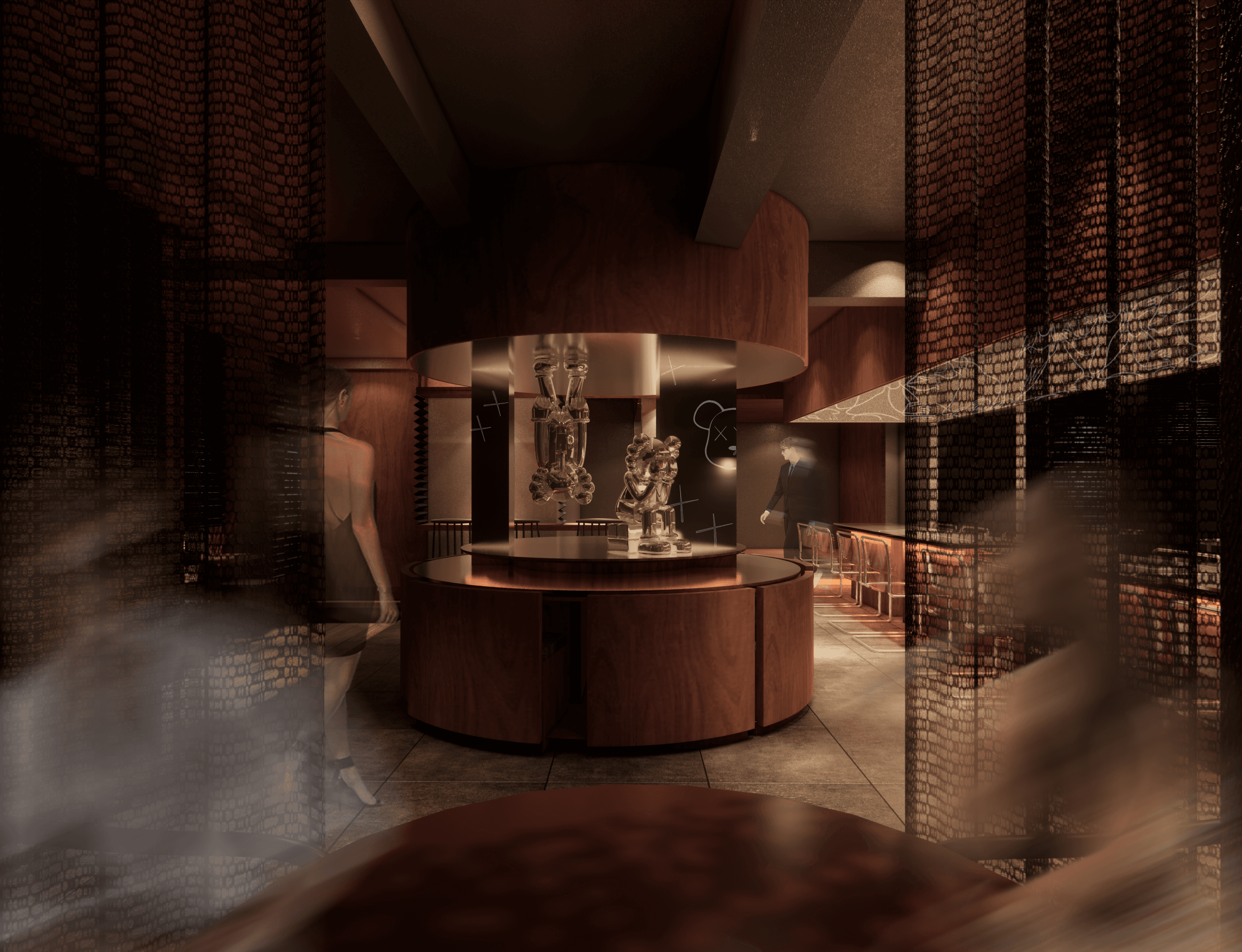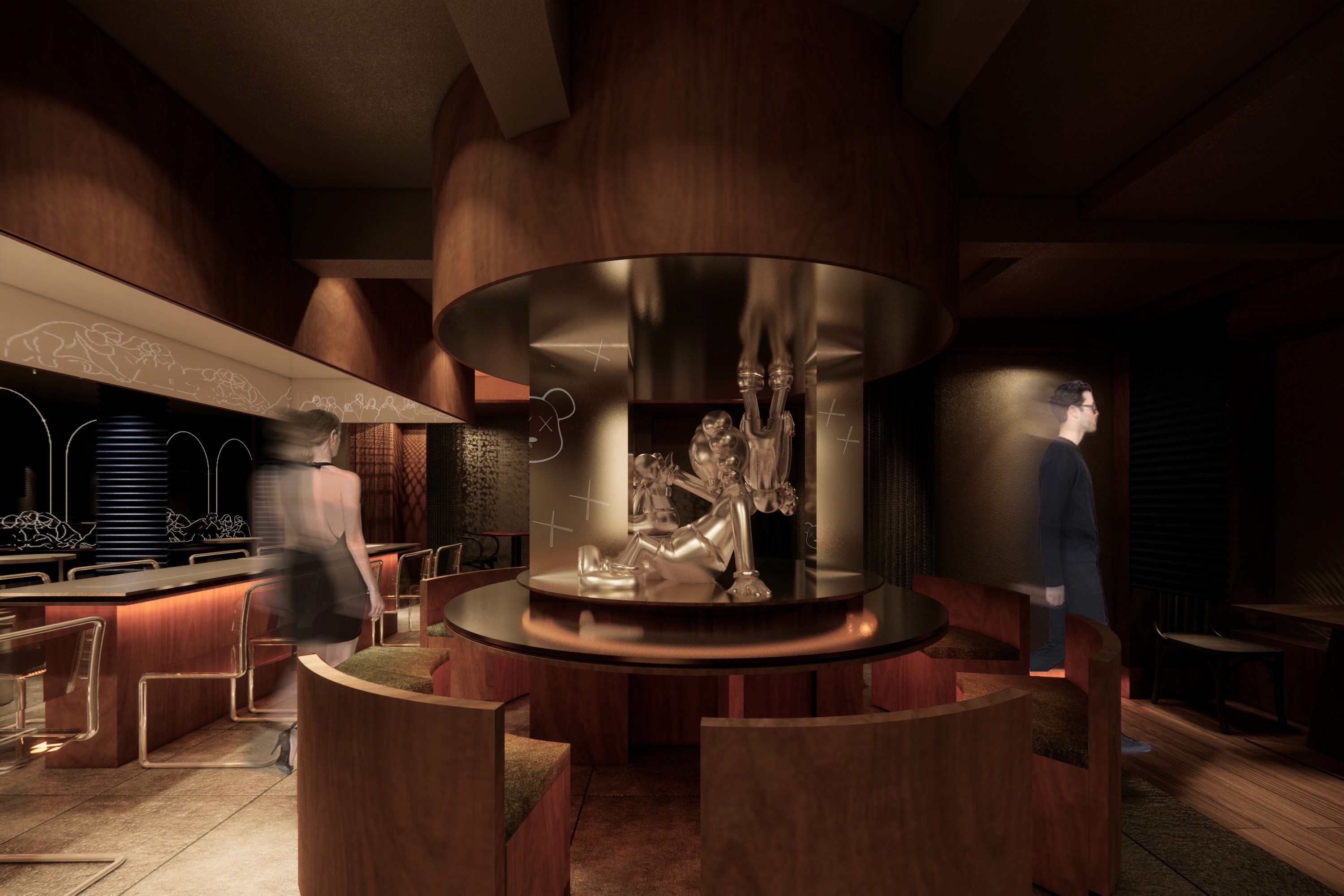 As visitors ascend or descend the spiral staircase, the dark green color enhances the overall ambiance, contributing to the immersive experience of being transported into a valley. This thoughtful design choice creates a harmonious interplay with the misty silver foil-covered surfaces, enriching the visual and sensory journey within SAD CAFÉ AND WINE BAR.