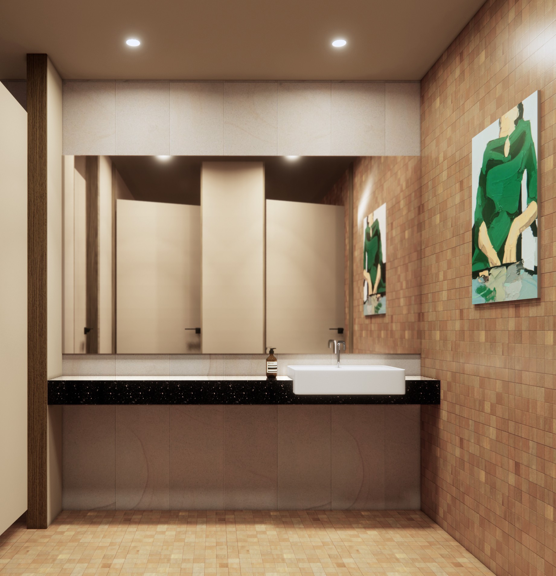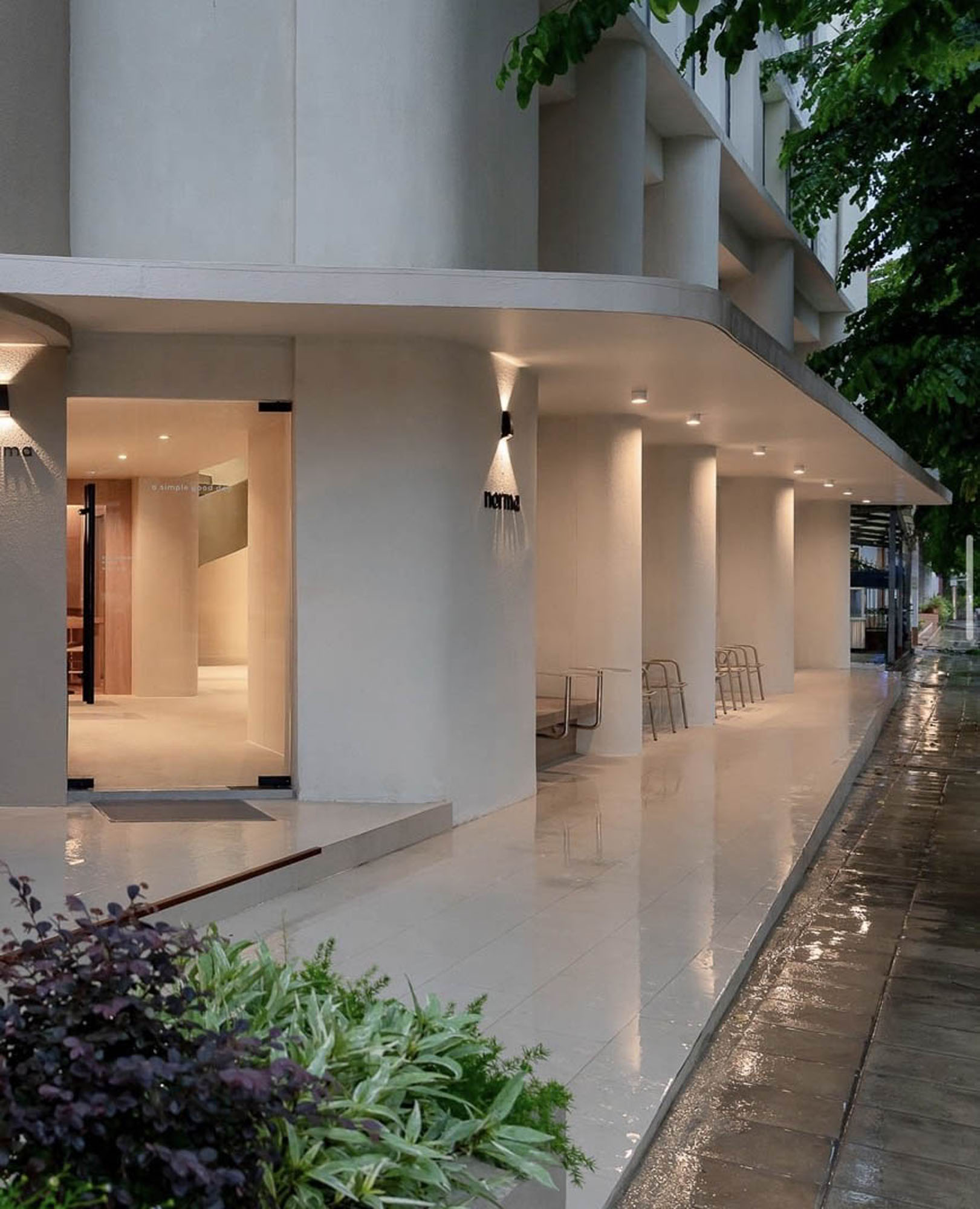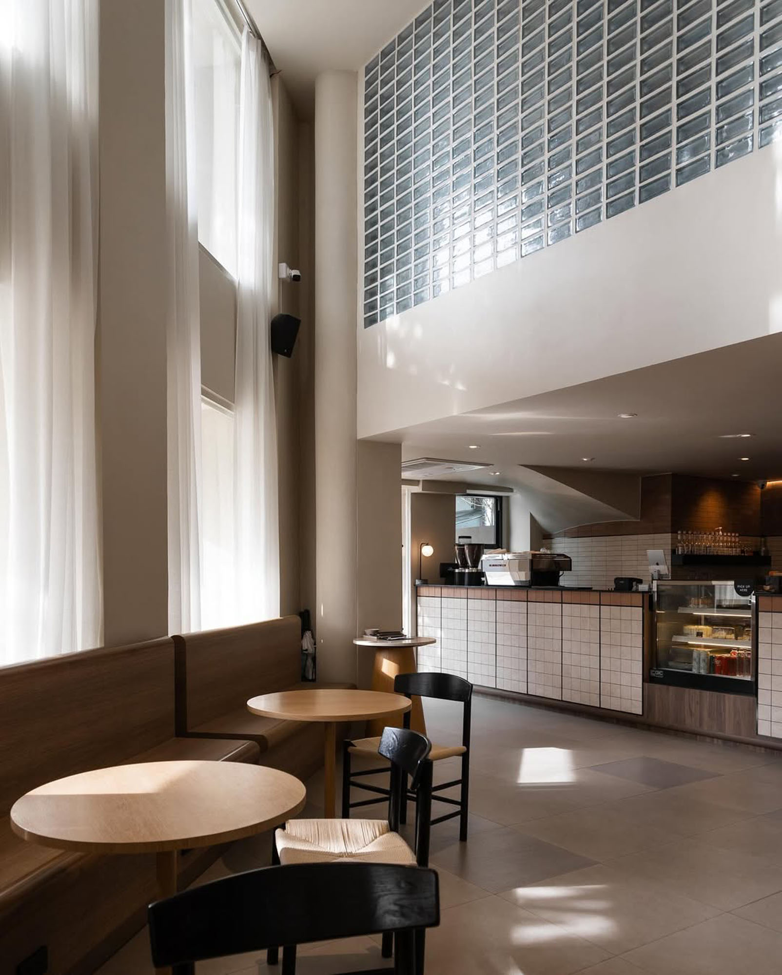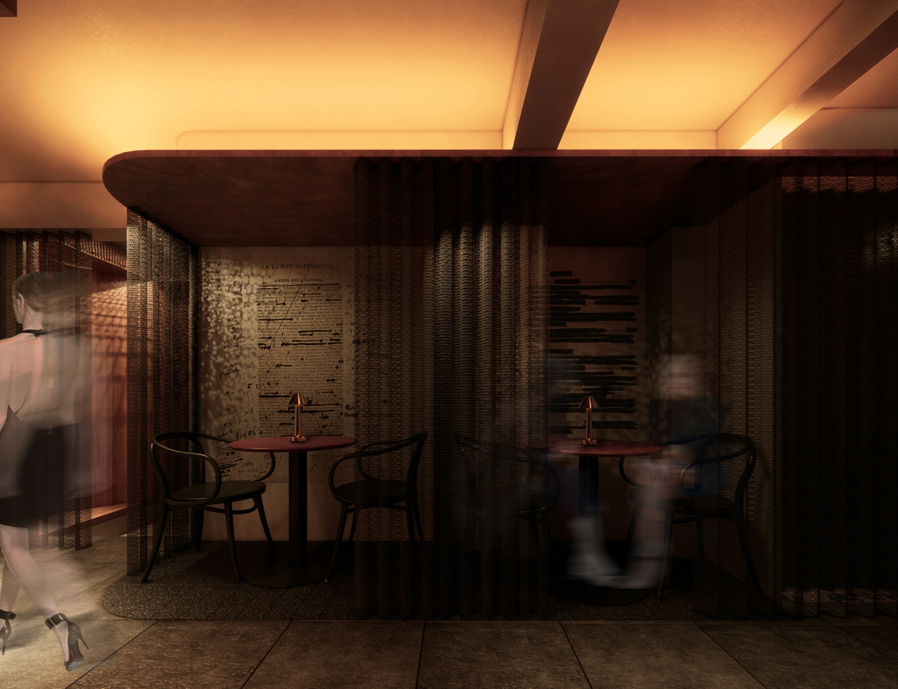 The restaurant's lighting design is intentionally restrained, featuring a sparse arrangement of spotlights on the ceiling and a modest LED strip positioned discreetly behind the bar counter, delicately illuminating displayed bottles. Additionally, a substantial bronze screen adorns the restaurant's facade, proficiently obstructing direct sunlight from infiltrating the interior.