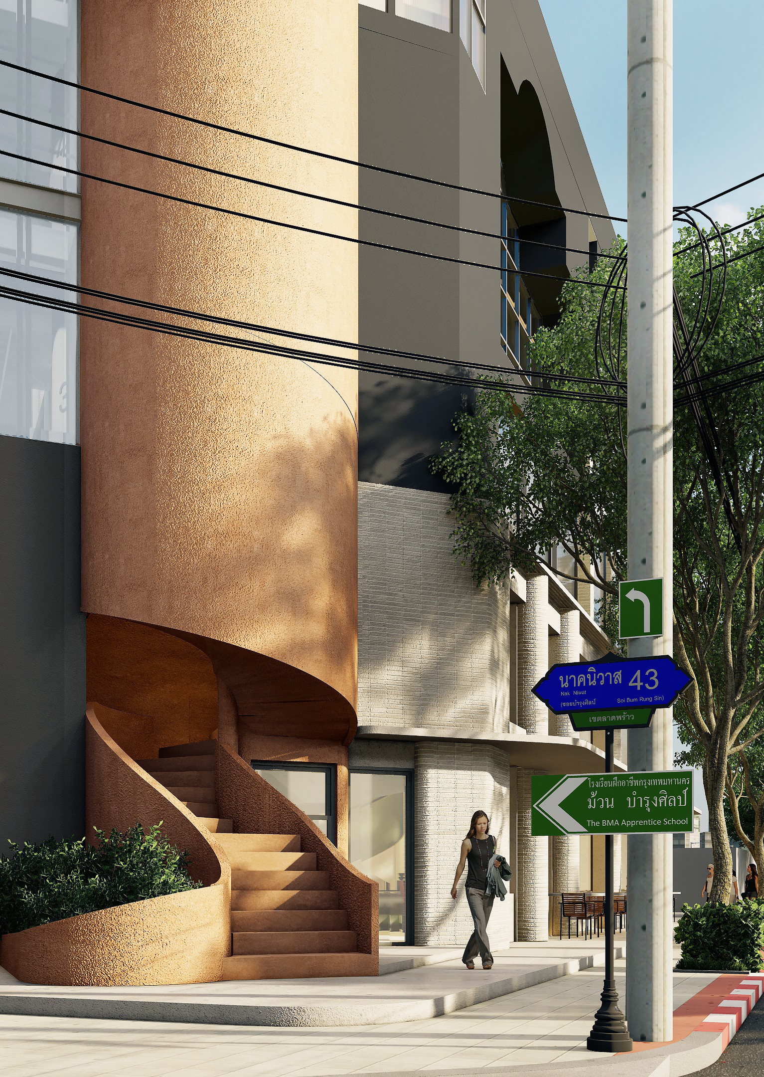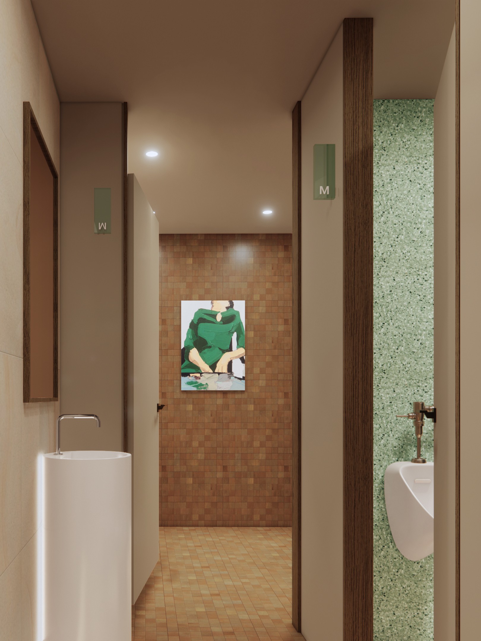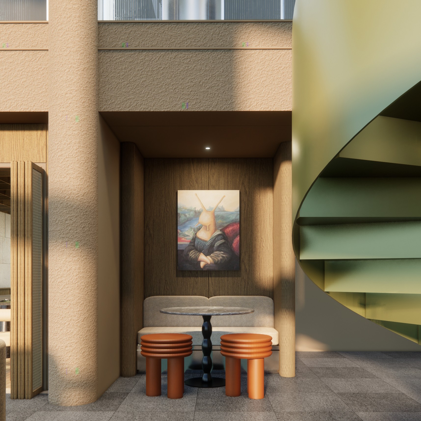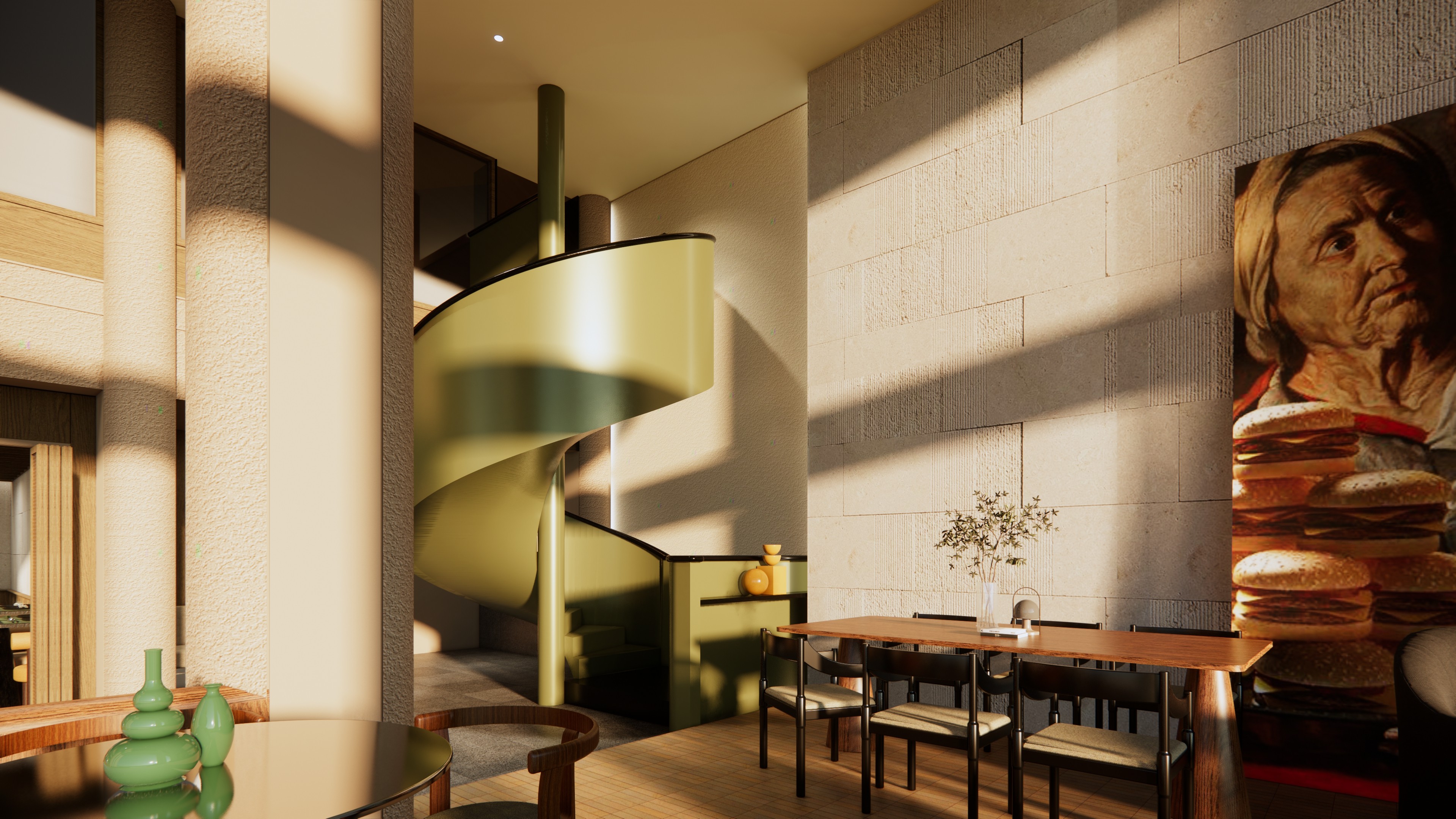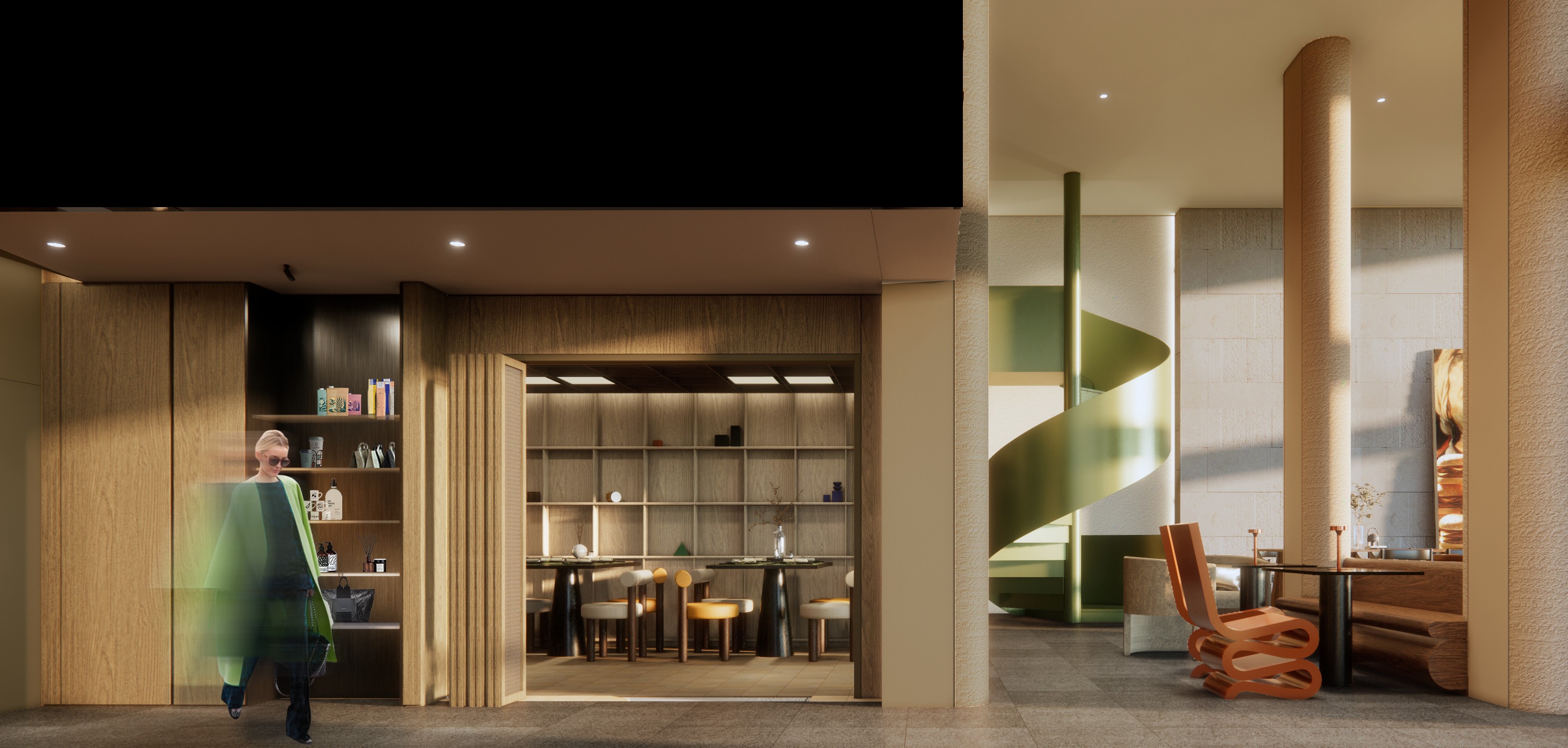 Expanding on the dark green spiral staircase, this distinct element in the shop adds a layer of sophistication and nature-inspired aesthetics. The deep green hue, carefully chosen for its moody and elegant undertones, not only serves as a functional means of vertical circulation but also stands as a visual focal point within the space. The staircase's color is reminiscent of lush foliage, introducing a calming and organic element that resonates with patrons.