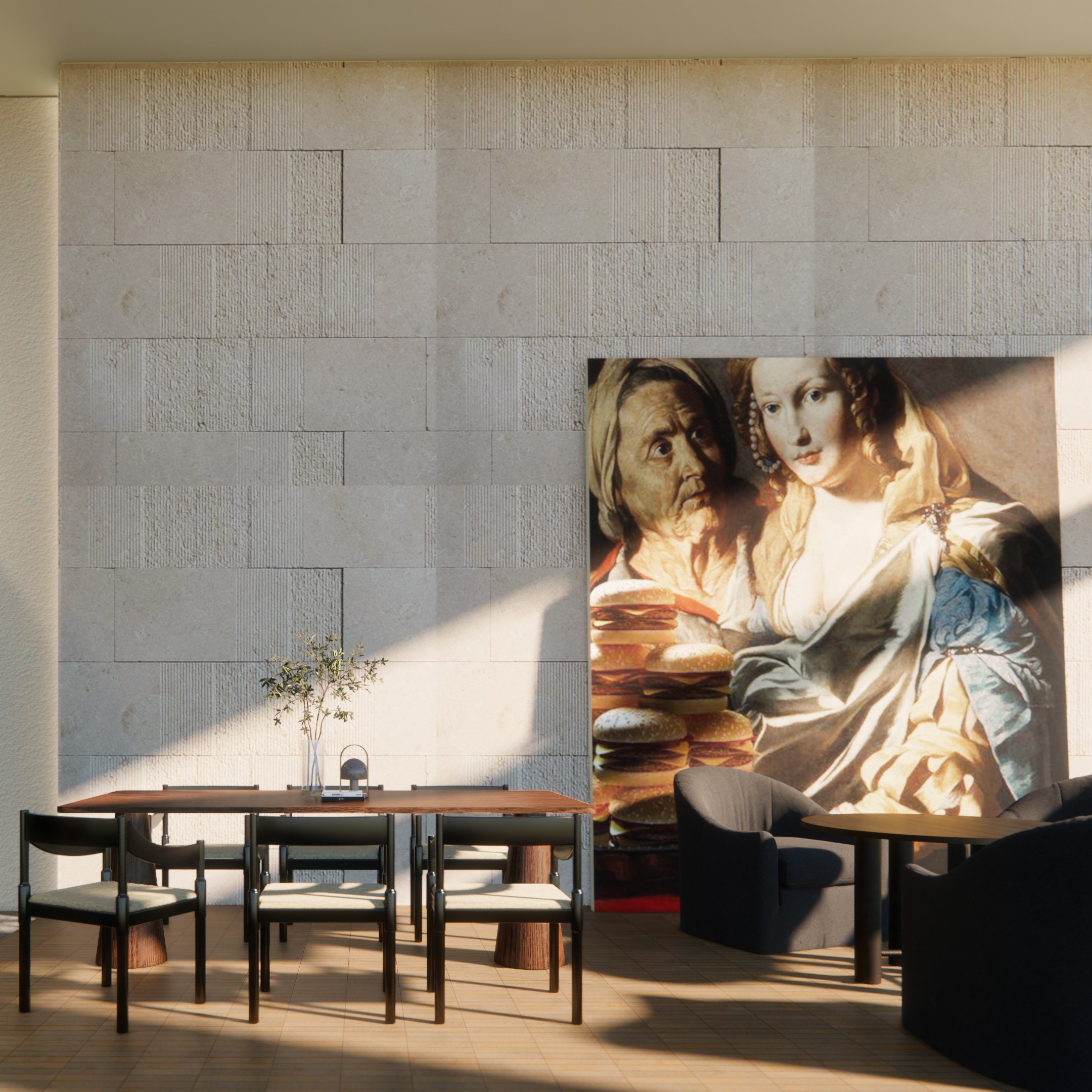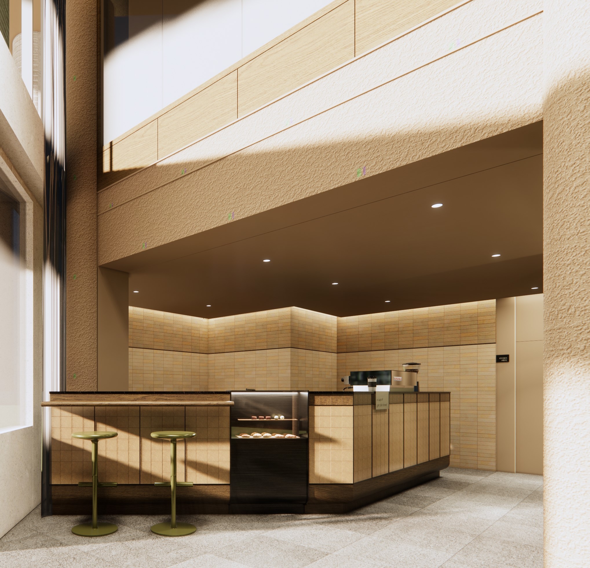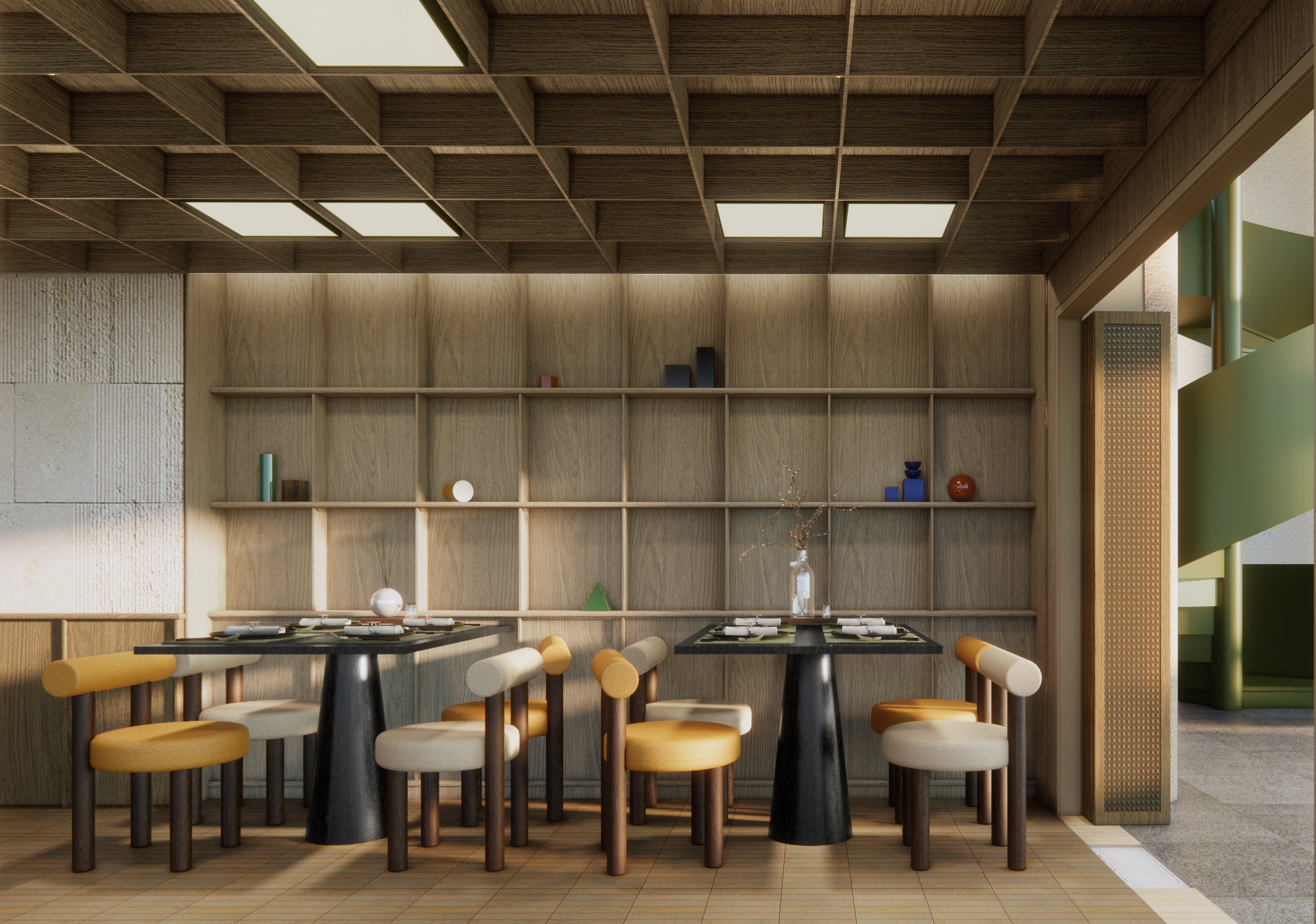 The design studio, inspired by the venue's expansive ceilings and intriguing shaded corners, sought to craft a dining ambiance evocative of "wandering in a valley." Upon entering, patrons are guided to the lounge area, conceived for relaxed moments with drinks and casual meals. Tables and inviting armchairs are thoughtfully positioned beneath a ceiling void, resembling a gully shaped by running water.