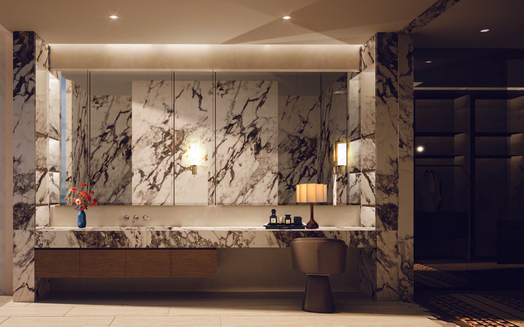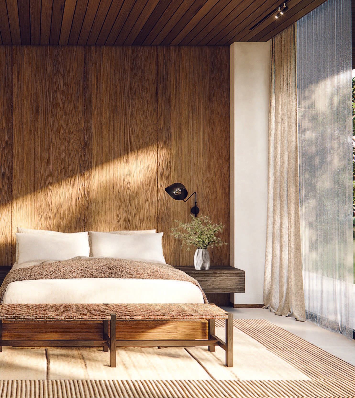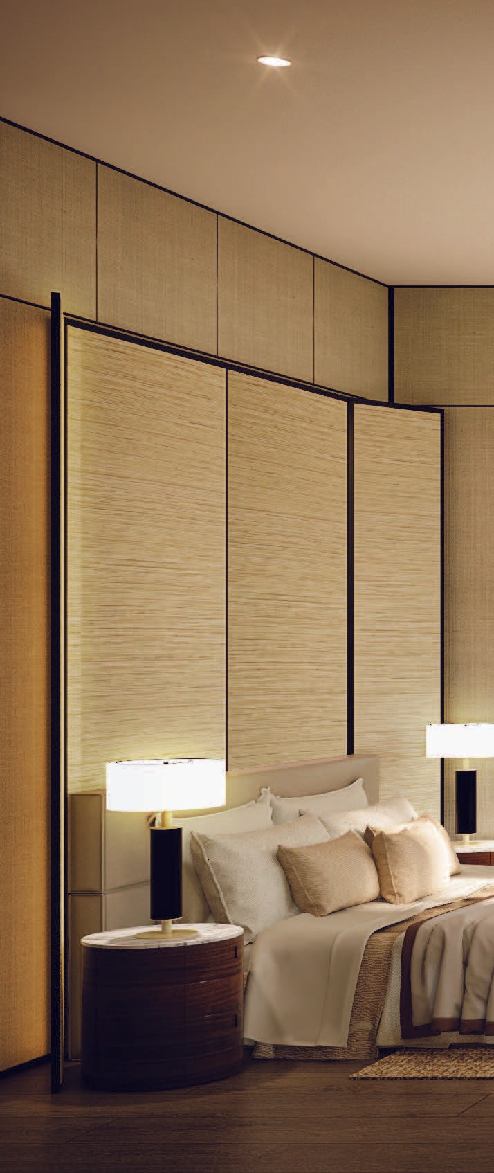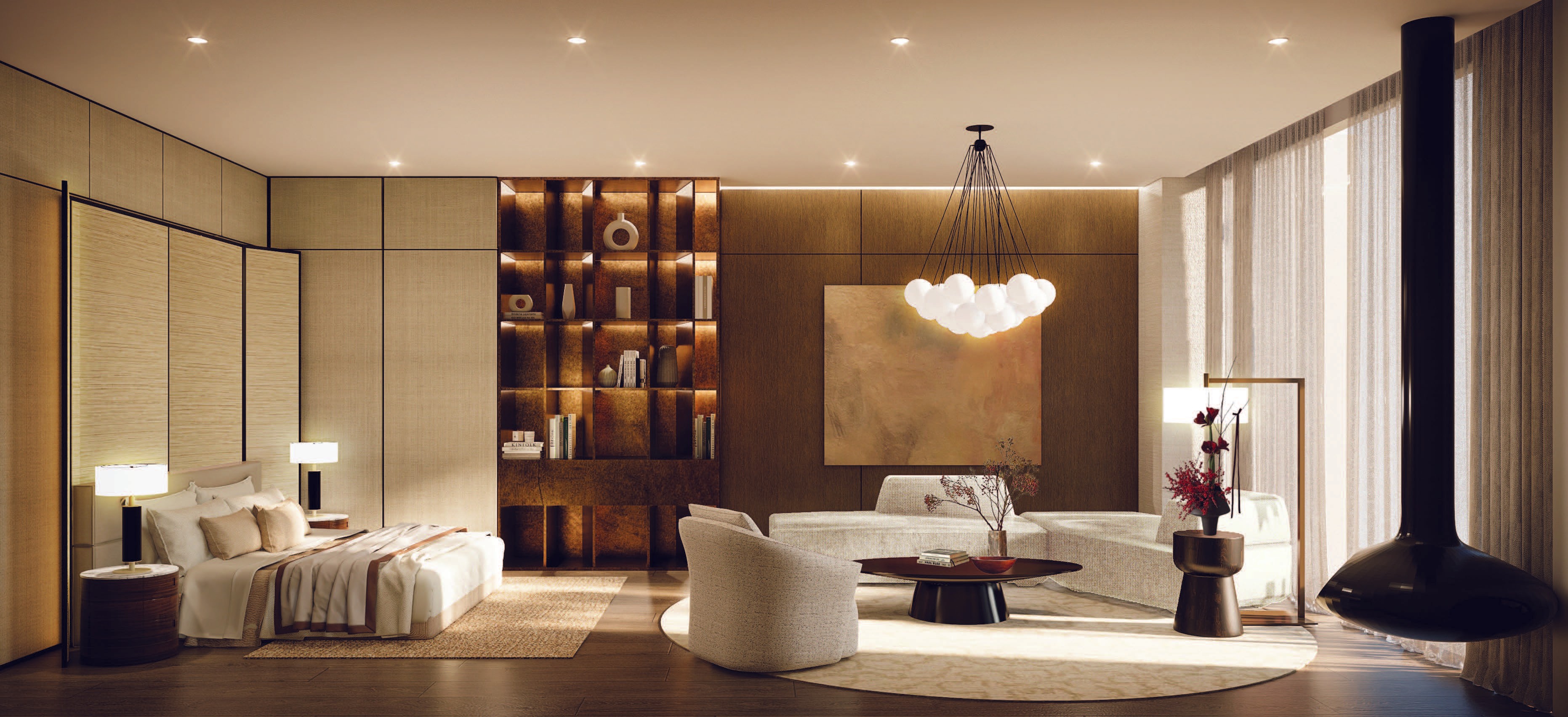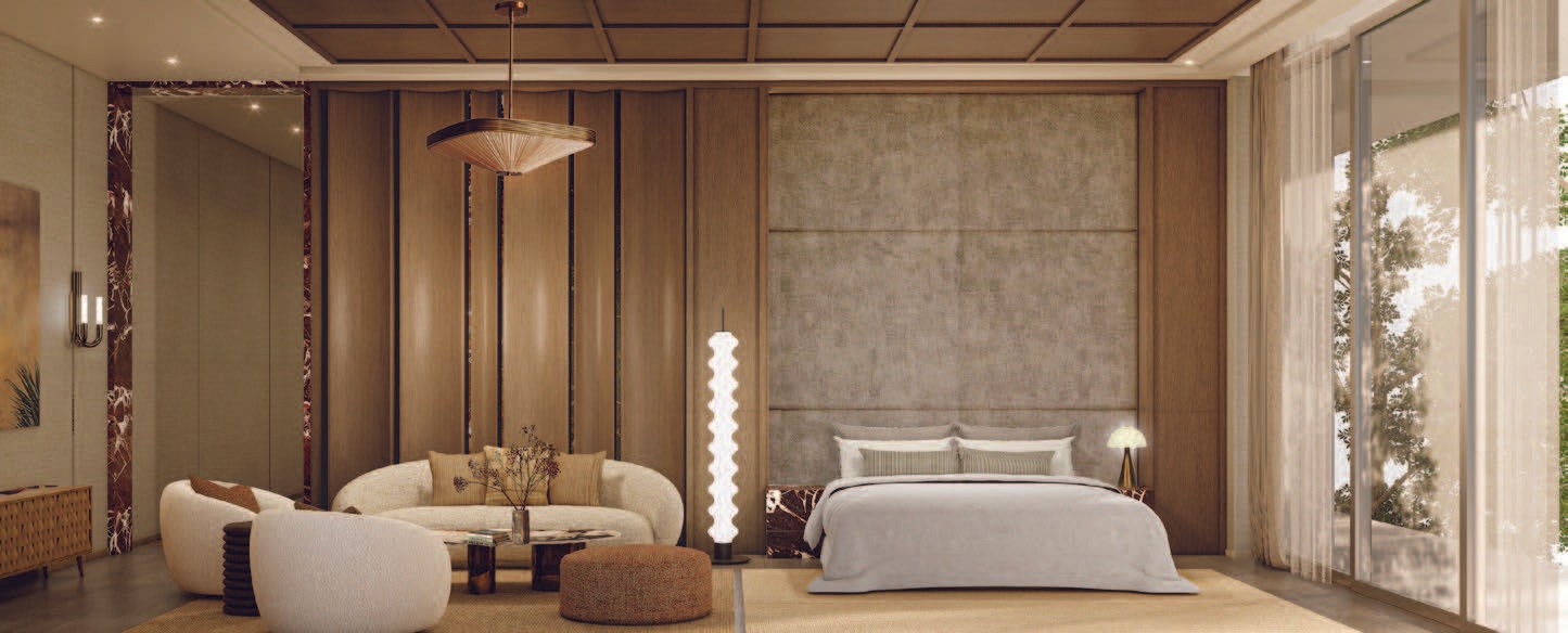 The interior embraces warm modern elegance, defined by natural textures, soft lighting, and a calm tonal palette. Layers of fabric, wood, and subtle color gradients create a serene and timeless atmosphere, while curated art and sculptural lighting add a touch of sophistication. The design reflects comfort and refinement—a private retreat that balances warmth, simplicity, and quiet luxury.