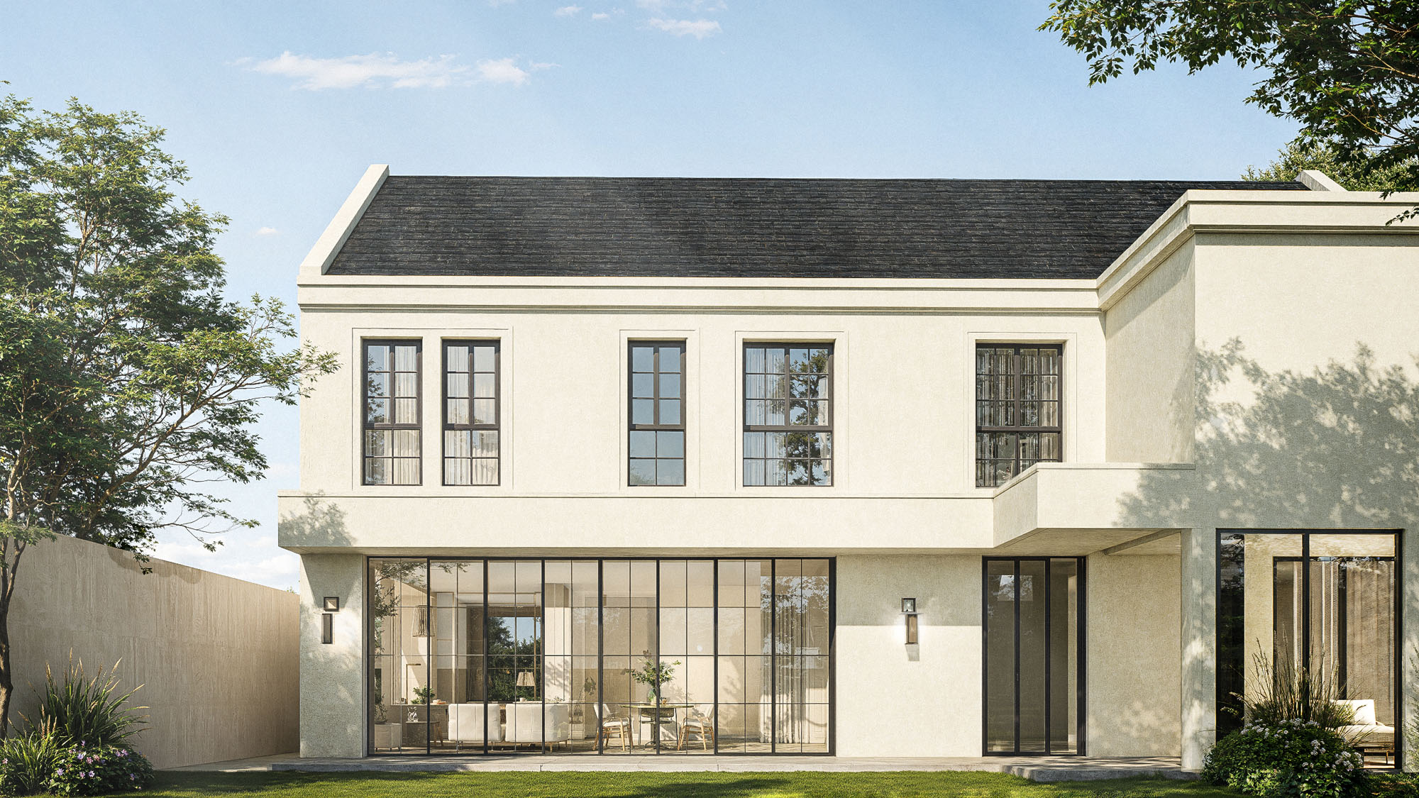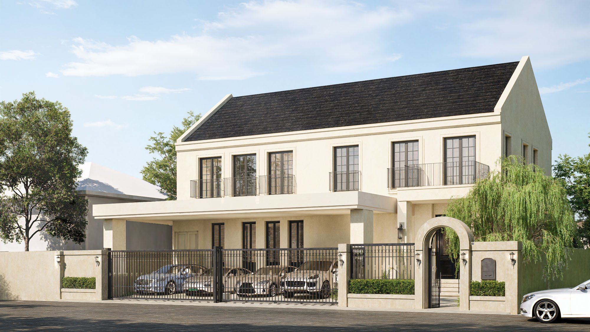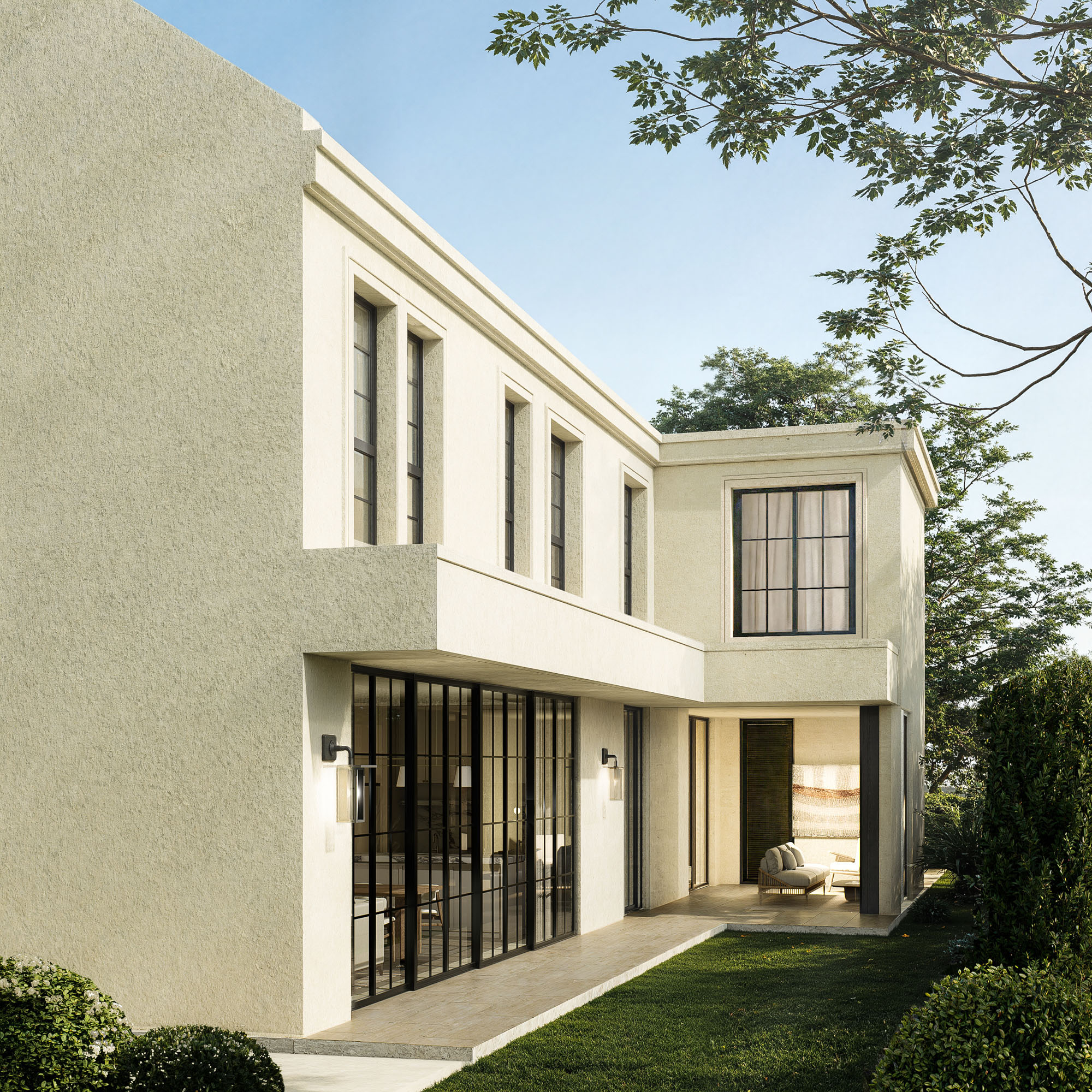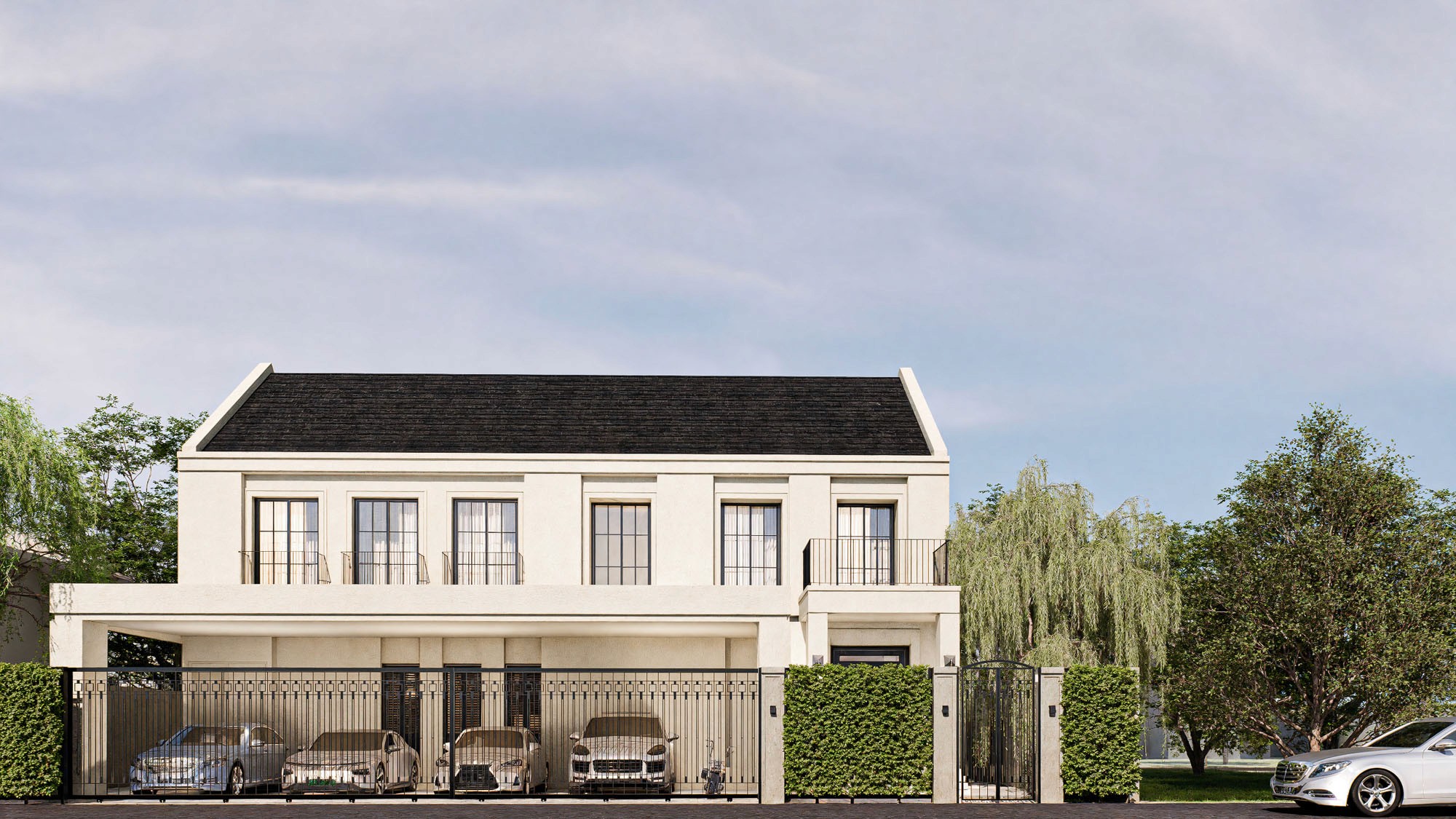 Blending classic proportion with modern refinement, the design conveys timeless elegance through its balanced symmetry, clean lines, and light-toned façade. Framed windows and subtle detailing evoke a sense of grace and order, while the landscape softens the architectural form. K MAY HOUSE reflects a contemporary reinterpretation of urban classic living—elegant, composed, and enduring.