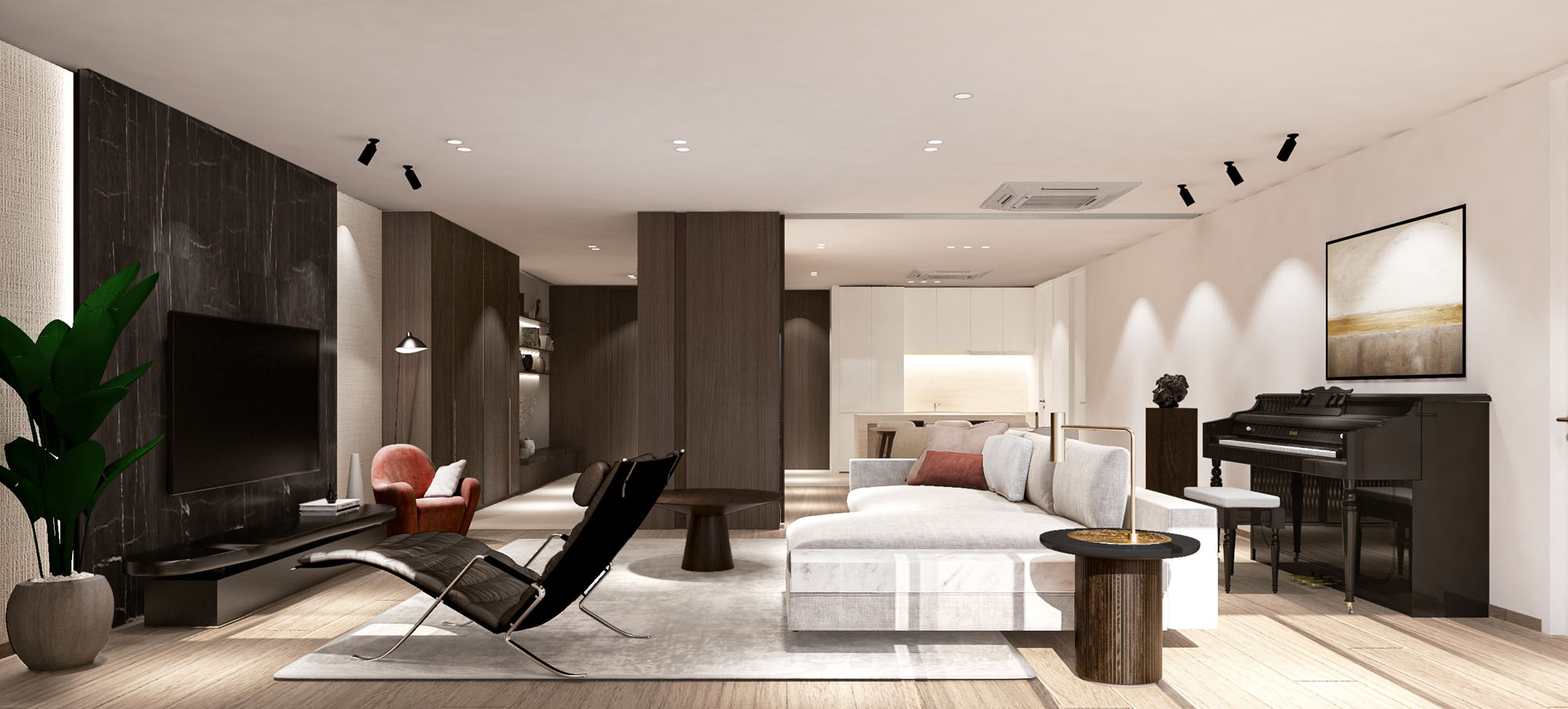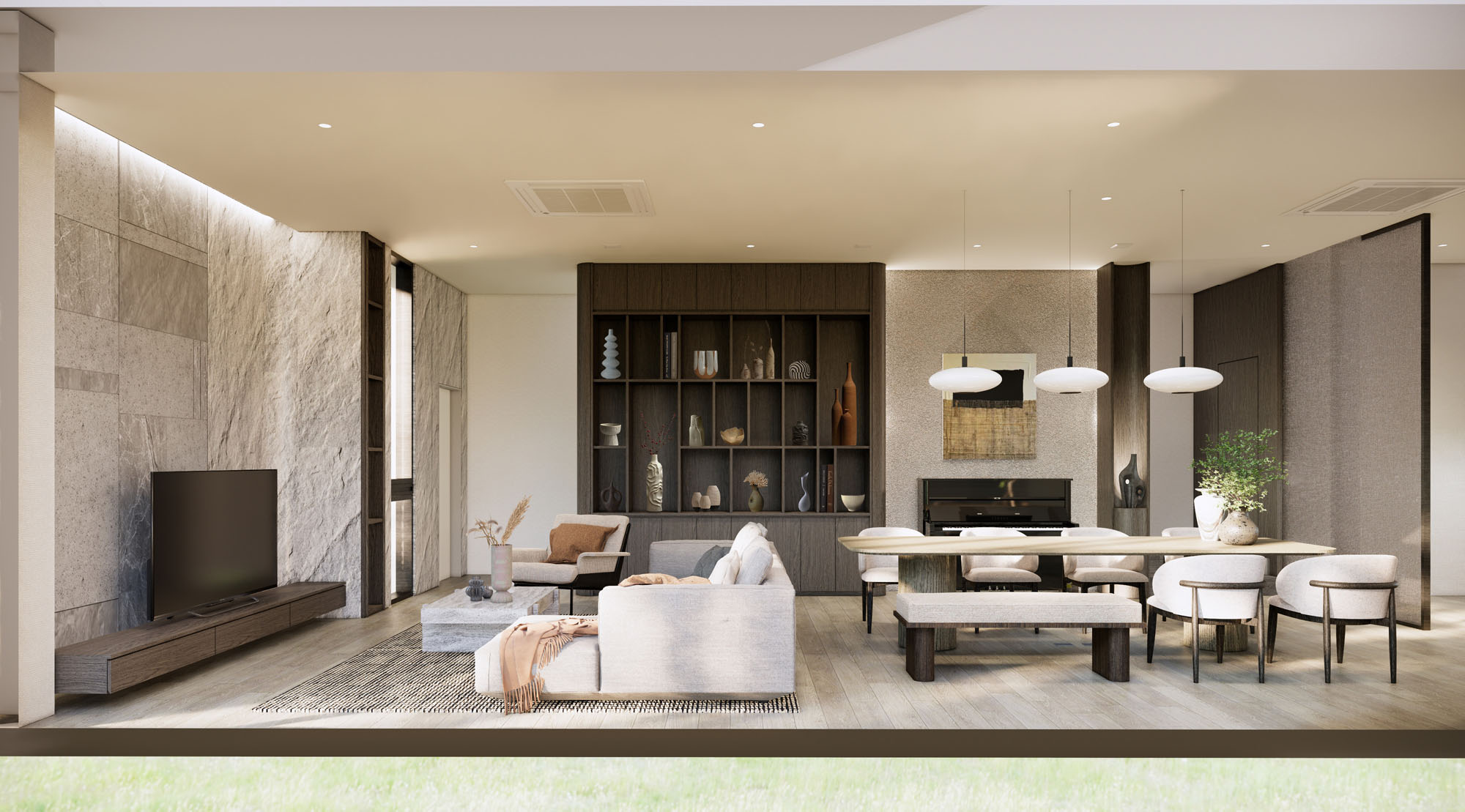 This house interior design embraces the synergy of modern elegance with the captivating combination of dark wood and stone, enhanced by the introduction of rough textures. The result is a space that exudes contemporary refinement while maintaining a tactile and grounded appeal, creating a home that is both visually compelling and inviting.