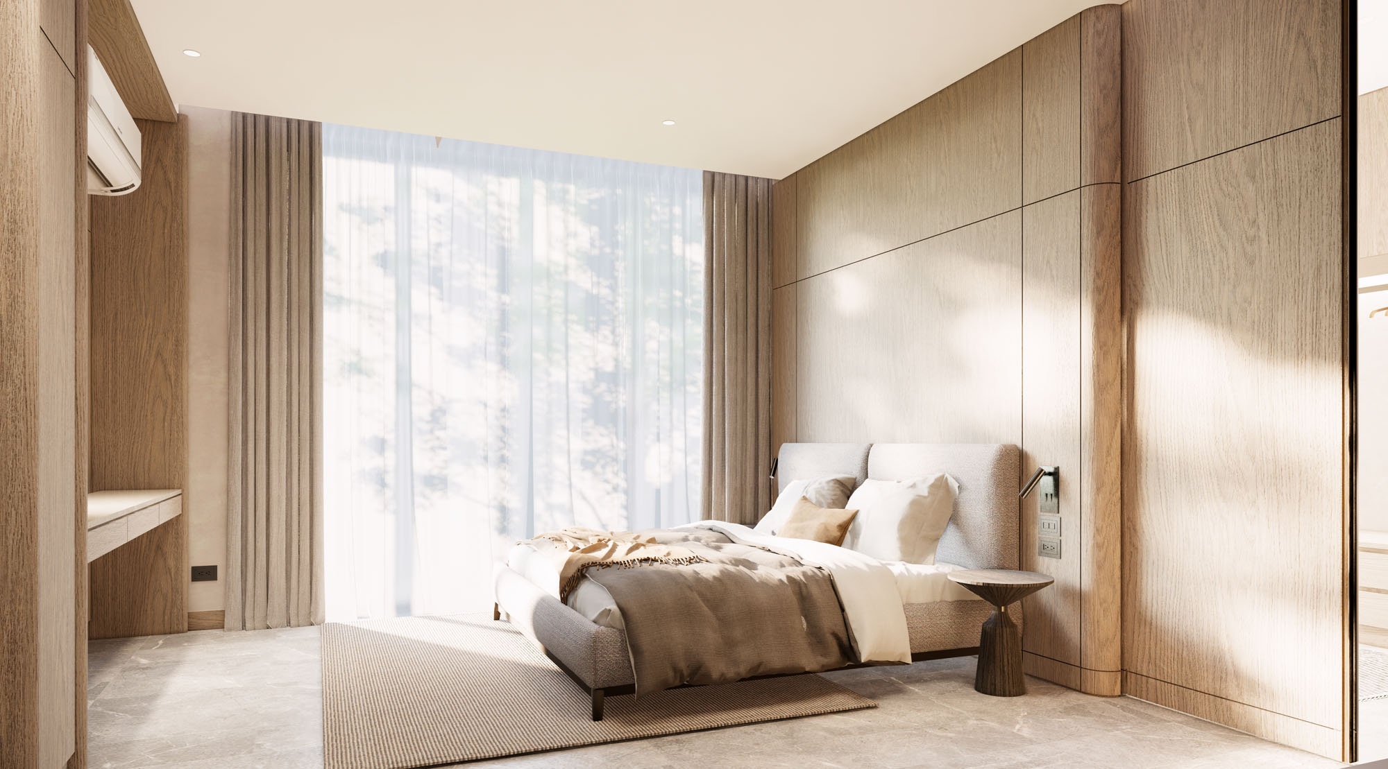 The house interior design concept seamlessly blends modern aesthetics with a rich palette of dark wood and stone elements, emphasizing a harmonious interplay of refined sophistication and raw, rough textures.